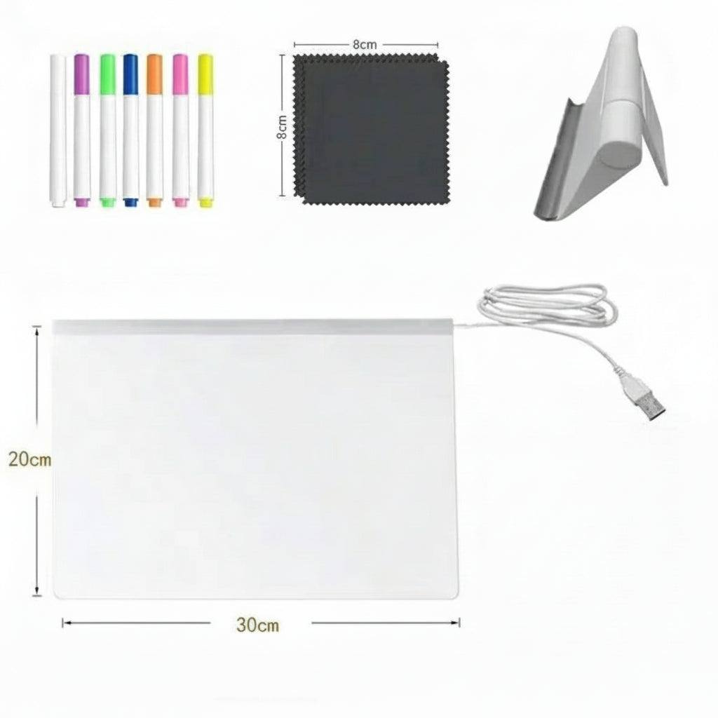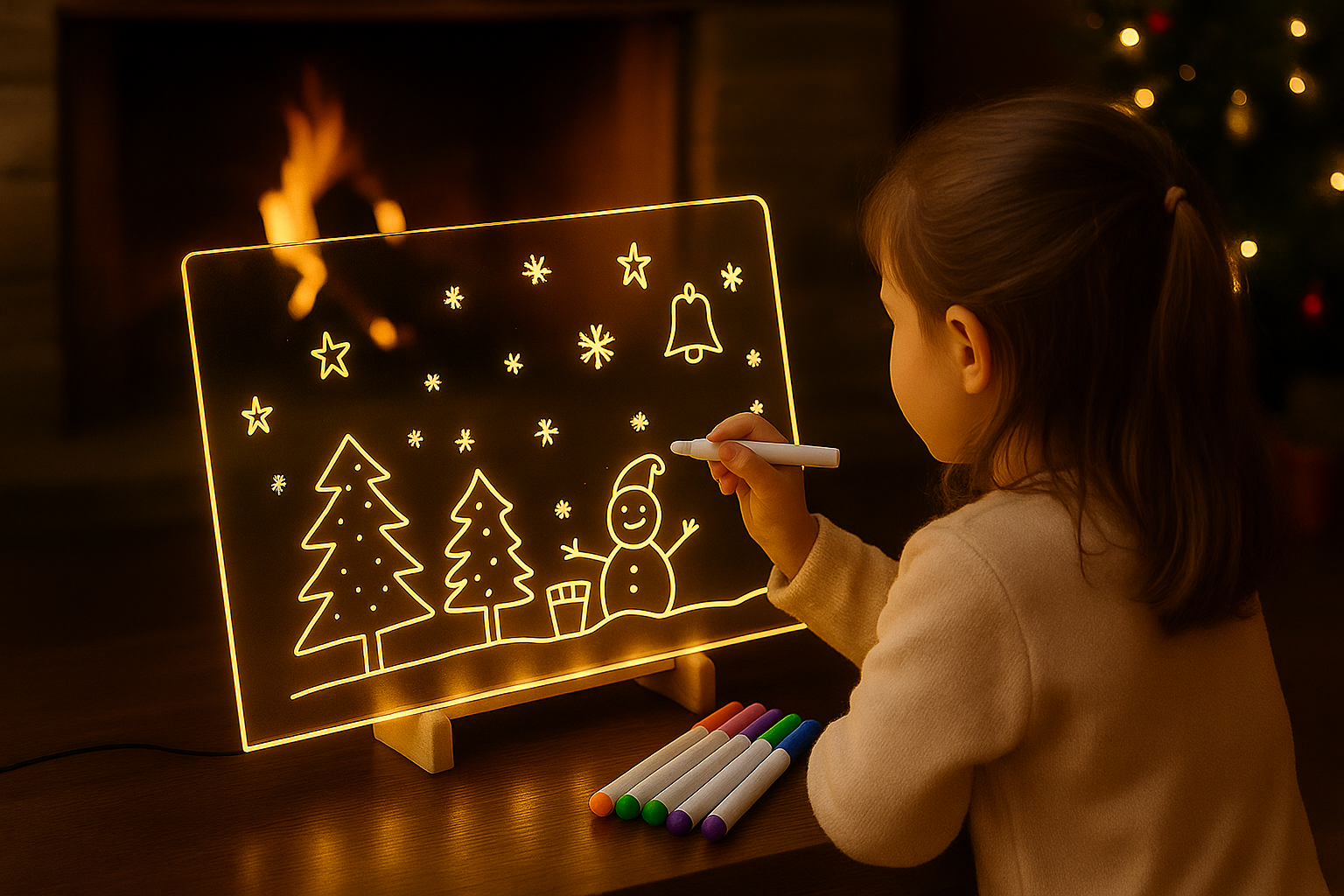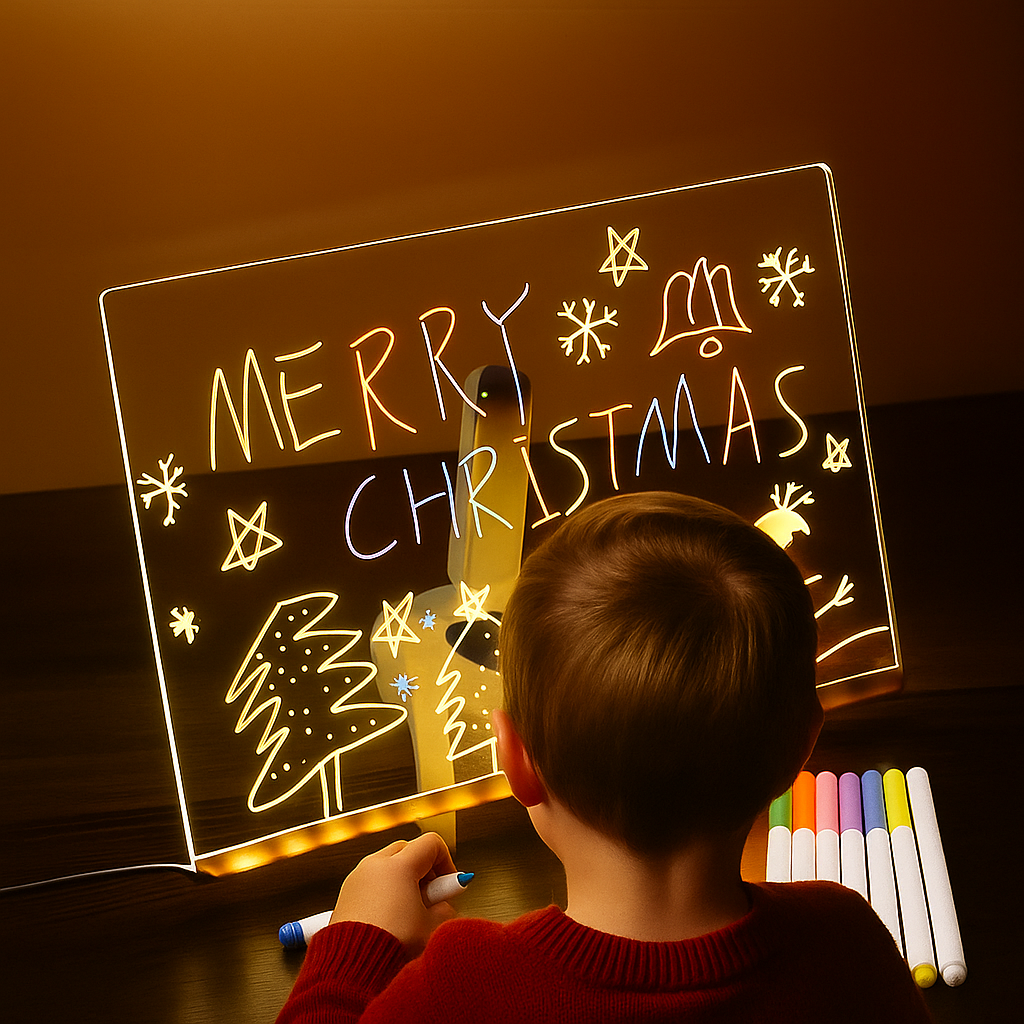 Tavlans färgglada LED-belysning gör varje teckning levande och magisk, och med de medföljande neonpennorna kan man rita, sudda och skapa om helt utan begränsningar. Den drivs enkelt via USB och passar lika bra i barnrummet som i vardagsrummet, på skrivbordet eller som en personlig julhälsning mitt i hemmet.